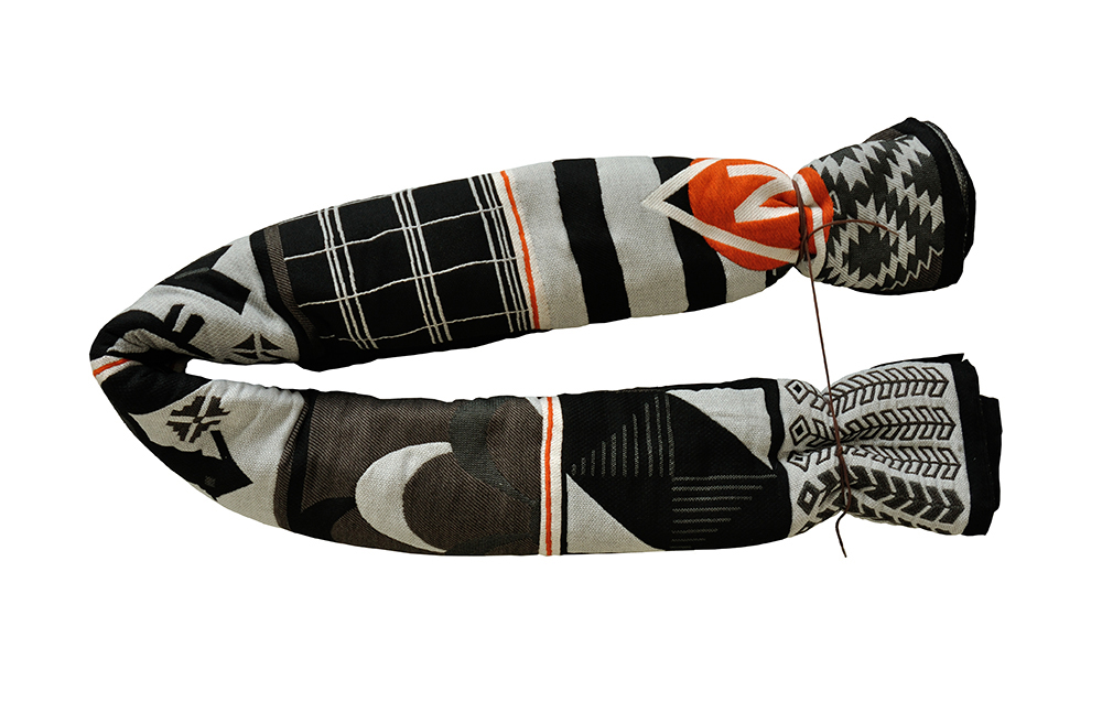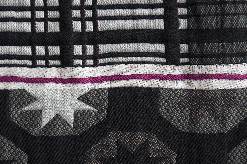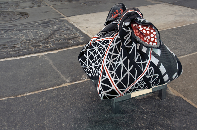 Simultaneous to the encounters with the suitcase, Mariëlle Videler researched concepts of travelling. She was touched by the contrast between travel by nomads, refugees and tourists. In reference to nomadic life and inspired by old photographs of travellers using blankets for travel bags, she created a series of woollen blankets. The design is based on a rectangular grid: the lines along which a blanket can be folded. Within this grid Mariëlle Videler adapted 27 different tribal patterns from around the globe. The blankets were woven at the TextielMuseum, Tilburg, from wool yarn in black, white and shades of gray, each with its own hue of red cotton. The red colours are mainly visible on one side of the blankets.