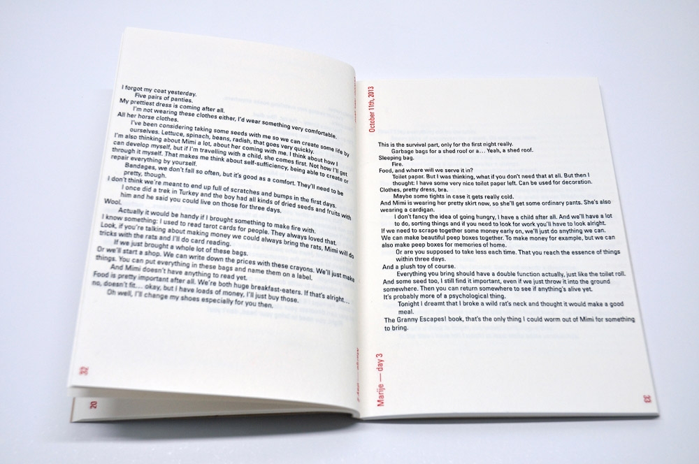 In the course of 2013 Mariëlle Videler visited a number of Amsterdam residents. She brought a empty suitecase, a metronome and a handmade ‘divination book’: concertina fold, stitched, with cut out texts, ink and pencil drawings. “You have 45 minutes to leave, you don’t know where you are going, you don’t know whether you’ll ever return here”, Mariëlle Videler read to them upon her arrival, and after every first round of packing she returned twice. This produced a series of fascinating conversations and encounters, which were documented in text.